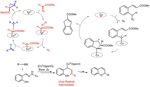 Carbene radicals are a special class of organometallic carbenes. The carbene radical can be formed by one-electron reduction of Fischer-type carbenes using an external reducing agent, or directly upon carbene formation at an open-shell transition metal complex (in particular low-spin cobalt(II) complexes) using diazo compounds and related carbene precursors.[1] Cobalt(III)-carbene radicals have found catalytic applications in cyclopropanation reactions,[2][3][4] as well as in a variety of other catalytic radical-type ring-closing reactions.[5][6][7][8]