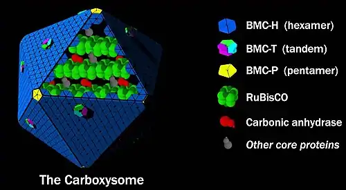 - ^ Rae BD, Long BM, Badger MR, Price GD (September 2013). "Functions, compositions, and evolution of the two types of carboxysomes: polyhedral microcompartments that facilitate CO2 fixation in cyanobacteria and some proteobacteria". Microbiology and Molecular Biology Reviews. 77 (3): 357–379. doi:10.1128/MMBR.00061-12. PMC 3811607. PMID 24006469.