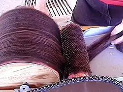 In textile production, carding is a mechanical process that disentangles, cleans and intermixes fibres to produce a continuous web or sliver suitable for subsequent processing.[1] This is achieved by passing the fibres between differentially moving surfaces covered with "card clothing", a firm flexible material embedded with metal pins. It breaks up locks and unorganised clumps of fibre and then aligns the individual fibres to be parallel with each other. In preparing wool fibre for spinning, carding is the step that comes after teasing.[2]
