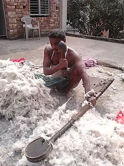 Science historian Joseph Needham ascribes the invention of bow-instruments used in textile technology to India.[4] The earliest evidence for using bow-instruments for carding comes from India (2nd century CE).[4] These carding devices, called kaman (bow) and dhunaki, would loosen the texture of the fibre by the means of a vibrating string.[4]