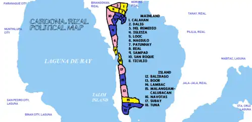 Cardona is politically subdivided into 18 barangays, as indicated below and in the image herein, [10] 11 of which are on the mainland and 7 on Talim Island. Each barangay consists of puroks and some have sitios.