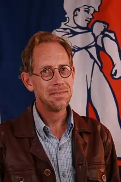 ![]() Carel Boshoff IV in front of the flag of Orania | |