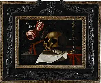 An example of a vanitas still life by Fonteyn is the Vanitas still life with flowers, a skull, hourglass, conch shell and silver jug on a partially draped table (signed and indistinctly dated lower centre on the parchment: Nicolaes van verendael / anno 1680, sold at Sotheby's on 7–10 December 2016 in London lot 20 as by Nicolaes van Verendael and sold at Sotheby's on 6 July 2017 in London lot 118 as attributed to Carel Fonteyn).[6][10] The work contains the token vanitas symbols such as a skull, an hourglass, watch, an extinguished candle, a pipe and pipe cleaner, wilted flowers and crumpled up books. The text on the parchment reads as follows: Een mensch vander vrouwen geboren corten tyt levende vervult met veel allendichheden (Man is born from a woman and lives for a short time a life full of misery).[10] The Vanitas still life with skull, playing cards, candle and flowers (signed on lower left: C L. Fonteyn, f, sold at Stockholms Stads Auktionsverk on 8 December 2010 in Stockholm lot 118) is a much starker picture that is made up of only a few of the typical Vanitas symbols which are shown in close-up and cramped together in the canvas.[11][12]