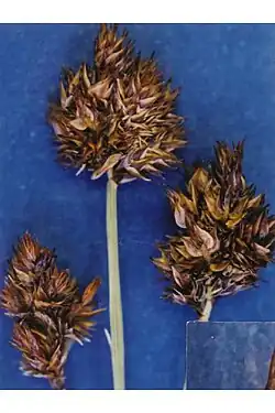 This perennial sedge forms a dense, erect clump, the stems of which may reach up to 70 centimeters in height.[3] Leaves are basal, with whitish sheaths, and with 3 to 6 blades per fertile culm.[4] The inflorescence is a rounded cluster of spikes 1 to 2 centimeters wide. Each fruit is surrounded by a sac called a perigynium. This is boat-shaped to scoop-shaped with a very narrow, cylindrical beak, which is coppery red to dark brown in color.[3]