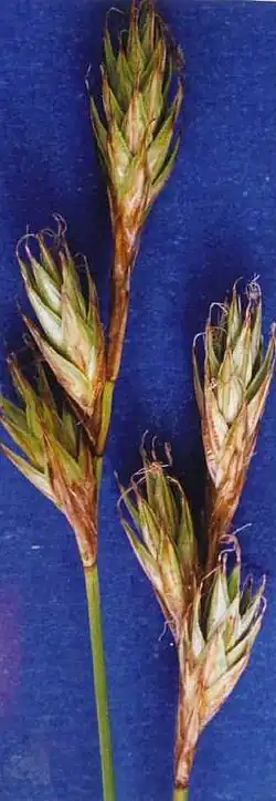The inflorescence is a light-colored open bundle of distinct flower spikes. The scale covering the female flower and the perigynium on the fruit are generally of pale color, white to cream to light brown.