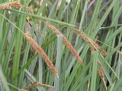 Carex spissa is a species of sedge known by the common name San Diego sedge in the family Cyperaceae.[2][3] It is native to the southwestern United States in California, Arizona,[4] and New Mexico,[5] and far northern Mexico. It grows in wet places such as seeps and streambanks, sometimes on serpentine soils.[5] This sedge looks somewhat like a cattail.[6] It produces angled stems easily exceeding a meter in height surrounded by leathery green to reddish leaves up to about 1.2 meters long. The inflorescence is up to 80 centimeters long, with many long reddish brown flower spikes, each holding up to 300 developing fruits.