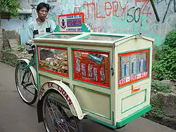 A tadpole configuration[1][2][3] is a three-wheel cargo bike with two front wheels, and usually either a large flat or a large box at the front for carrying luggage. The box can also be replaced by seats so that passengers can be transported with it. Although bakfiets is the Dutch word for cargo bike in general, it has traditionally mainly been used for such three-wheeled cargo bikes with two front wheels.[4] In Flanders, such three-wheel cargo bikes are often called triporteur, which is probably a combination of tricycle (three-wheeled bicycle) or tricar (three-wheeler) and transporteur (transporter). On the other hand, two-wheel cargo bikes (like Long John's) are called biporteur or Deense bakfiets ("Danish cargo bike").