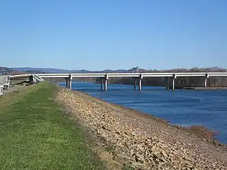 After the demolition of the old bridge, the southbound bridge carried traffic in both directions as single lanes separated by a temporary concrete barrier. Meanwhile, the new northbound span was built in the same location as the old bridge, just east (downstream) of the southbound span.[3] The northbound bridge opened to traffic on October 10, 2007, originally as a single lane.[4] There were two lanes of traffic in both directions on the bridge by October 15, 2007, the day that three of the four "direct connect" ramps between Interstate 180 and the bridge officially opened. The traffic lights controlling the new single-point urban interchange were activated the same day, and the last ramp, from the bridge to westbound I-180, opened by October 18. (The ramp from eastbound I-180 to the bridge had been open over a year, but only to traffic then going south.)[5]