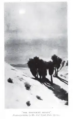 But to Carl Eytel, pioneer of Palm Springs artists, working there long before the world of fashion had heard of the place, Palm Springs was his home, and the desert his life. He knew it in all seasons, in all moods, and he painted it with a sort of religious ardor springing from unfailing love, in season and out. Others have been better draughtsmen than he, but when you look at a canvas by Eytel at his best you are looking into what seems the desert's heart.[46]