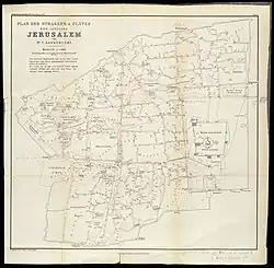 Sandreczki conducted a 10-day survey in which he documented the streets, gates and buildings of the city for the Ordnance Survey of Jerusalem[2] and provided the Arabic names for locations, as well as two maps - one of the city, and one of the Temple Mount.[5] The survey, Namen der Plätze, appeared in a shorter English version in Wilson's Ordnance Survey.[6]