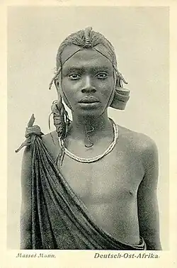 Another portrait shows a three-quarter view of a Swahili youngster next to a young woman. The young man wears the Islamic headdress kofia and a kanzu shirt; the woman a turban and a kanga wrapped dress, as well as necklaces, earrings and bracelets.[22] The half-portrait of Wali Mohamed bin Salim, a dignitary from Mikindani, shows the sitter with typical garments of his Arab descent and the curved dagger jambia. Pictured in a studio portrait for a postcard around 1900, a young man of the Maasai ethnic group with typical hairstyle looked straight at the camera.[23][24]