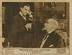 ![]() Macy (right) in a lobby card for his film debut, A Woman's Past (1915) | |