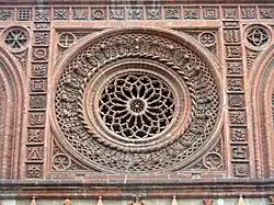 A recurring theme in Maciachini's style is the extensive use of dense patterns of geometric shapes and symbols in the decoration of facades, rose windows, and other architectural elements. It has been noted that, despite working on religious buildings, Maciachini made very little use of Christian symbols: for example, the chapels in the Famedio (the core building of the Monumental Cemetery) did not include any Cross symbol in Maciachini's original design.[1][5] On the other hand, stars of David, pentagrams, (left-facing) swastikas, triskelions, and other non-Christian symbols are found in many of Maciachini's facades and architectures.[7][8] This predilection for "pagan" (possibly esoteric) symbols has aroused a number of theories alleging that Maciachini was an affiliate of some sort of secret organisation, such as a Freemasonry society.[1][5][8]