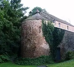 At the far west end of the town is the village of Barry. On the north side of the road that runs through the village, to the west of the Barry Burn is the kirkyard and ruins of the old parish church. To the immediate east of this, a road heads north towards the old A92. Half a kilometre up this road, on the left hand side is the medieval motte associated with Grange of Barry, from where the monks of Balmerino Abbey managed the parish from the 13th century.[10] On the other side of the road, a driveway runs towards the old Upper Mill, now simply known as 'Barry Mill', a water powered corn mill dating from 1815, when it was built on the site of a much older mill dating to the 16th century.[61] The Mill is a Category A listed building and the nearby bridge which was part of the old road from Barry Grange to Panbride is Category B listed.[61][86]