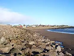 Carnoustie occupies a seafront position on the North Sea coast of Scotland, on land immediately northeast of the Buddon Ness, 10 miles (16 kilometres) ENE of Dundee,[77] 6+1⁄2 miles (10 kilometres) SW of Arbroath[77] and 13 miles (21 kilometres) SSE of Forfar.[77] The town lies 42 miles (68 km) NNE of Edinburgh[77] and 360 miles (580 kilometres) NNW of London.[77] The built-up area occupies a roughly rectangular shape measuring 2 by 1⁄2 mile (3 by 0.8 kilometres). The land is relatively flat, rising gradually to around 30 m elevation to the north of the town.[78] The climate is typical for the east coast of Scotland, although the weather can be locally influenced by sea mist, locally known as haar.