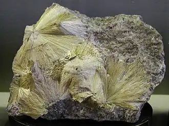 Carpholite is a manganese silicate mineral with formula Mn2+Al2Si2O6(OH)4. It occurs as yellow clusters of slender prisms or needles. It crystallizes in the orthorhombic system.