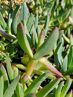 Karkalla leaves are succulent, 3.5–10 centimetres (1.4–3.9 inches) long and 1 cm (0.4 in) wide, and curved or rarely straight.[5] The flowers bloom from August through October,[6] are light purple, and are 6 cm (2.4 in) wide. The globular purplish red fruit is about 2.5 cm (1 in) long and 1.5 cm (0.6 in) wide.[5]