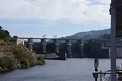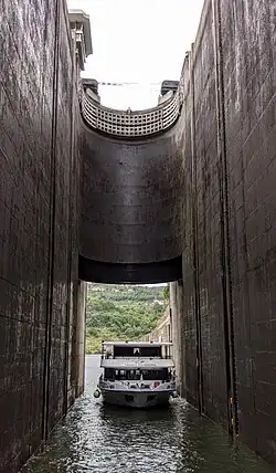 On the right side of the dam is a lock, which can handle ships with the following maximum properties: 83 m in length, 11.40 m on the beam, 3.8 m load-draught and a cargo capacity of 2500 tons.[6] The water level change through the lock is about 35 m.
