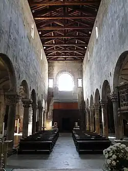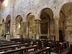 The interior of the cathedral consists of a taller nave with exposed wooden trusses, and two smaller cross-vaulted aisles.[1] It houses the sarcophagus of St. Ceccardus, patron saint of Carrara, a 14th-century "Annunciation" (example of Pisan sculpture), and a 14th-century wooden crucifix by Angelo Puccinelli. There is also a white marble pulpit in the presbytery that was installed in the 16th century.[1]