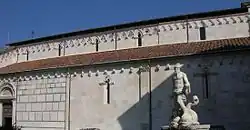 The lower section of the façade and the side area near the St. John Portal are characterized by a bichrome decoration with geometrical marble tarsias. This part of the building can be dated to the early 12th century by the influences of the Pisan Gothic style on the capitals and the architrave as well as the similarities in the alternating black and white marble patterning with the Tuscan churches of Pisa and Lucca.[1] This style was also widespread in Liguria at the time, as shown by the similarity of the cathedral's portal with that of Genoa Cathedral, finished before 1142. The sculptors of the main portal and of the capitals of the first three spans in the interior belonged to the school of Maestor Wiligelmo.[1]