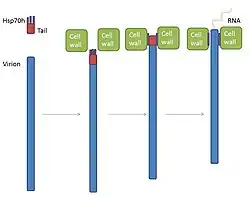 - The tail disassembles when Hsp70h stays in the channel. Without the tail, the body is less stable and RNA is exposed into the neighbour cell cytoplasm; the viral genome has successfully infected another cell.