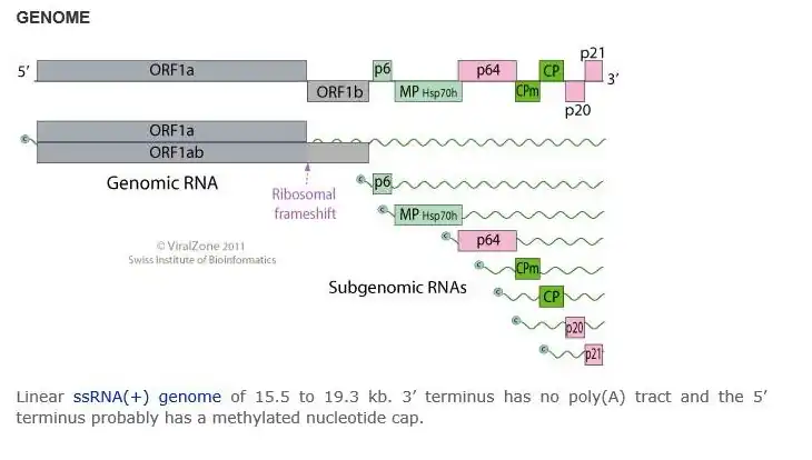 The +ssRNA genome is 15.5 to 19.3 kb, contains a 3’ terminus, and does not have a poly(A) tract. The 5’ terminus commonly has a methylated nucleotide cap. The virus genome is 1250-2200 nm in length and 10-13 nm in diameter.[2]