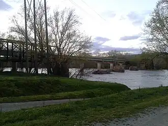 Cartersville Bridge is a historic bridge located near Cartersville, Cumberland County, Virginia. The original bridge was constructed in 1822, and its five stone piers of rough cut ashlar and rubble and two stone abutments remain. Atop them is a superstructure constructed in 1883-84 of heavy timber members with cast-iron connections arranged to form a truss configuration based on the Pratt truss. The bridge is composed of six spans with an end-to-end length of 843 feet (257 m).[3]