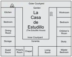 The main portion (the center) contains the entrance, facing west. To its left is the chapel and to its right is the schoolroom. Both rooms originally were smaller, with bedrooms located at the ends of building, but a 1910 restoration eliminated those walls to enlarge the rooms. Two bedrooms, a living room, a kitchen (which was added at a later date), and the servants' dining room are in the north wing, while the south wing has three bedrooms and the family dining room. The house is topped by a cupola from which bullfights and festivals in the adjacent plaza could be seen.[5]