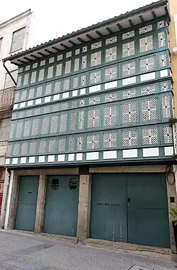It has a simple longitudinal, rectangular plan with a vertical volume extending to three floors, with a differentiate covering in tile.[1] The principal facade (oriented to the northwest) includes three entrances, covered in wood doors.[1][2] The facade of the second and third floors are totally covered in wood-lattice painted in white, while the box frames are painted green.[1][2] This type of covering/window was utilized during the 17th century by many families in Braga, a town considered conservative, as a means of safeguarding privacy in a religiously conservative town.[2][3]