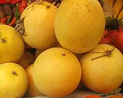 The honeydew melon is one of the two main cultivar types in Cucumis melo Inodorus Group.[3] It is characterized by the smooth, often green or yellowish rind and lack of musky odor. The other main type in the Inodorus Group is the wrinkle-rind casaba melon.[4]