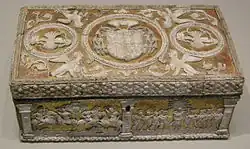 The Embriachi workshop in north Italy, and their imitators, specialized in "marriage caskets", presumed to have been presented to a bride-to-be by her new in-laws. These were decorated with carved bone plaques, within a setting of certosina inlays in wood, and were produced in the decades around 1400.[4] Later in the 15th century caskets decorated in pastiglia, a type of moulded plaster or gesso, became common for similar purposes.[5]