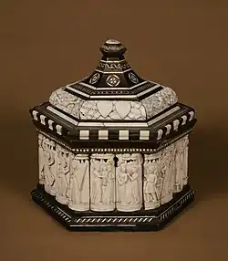 A tall round casket is often called a pyxis, after a shape in Ancient Greek pottery; these were popular in Islamic art, often made from a section of the ivory tusk of an elephant.