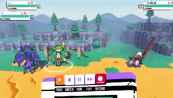 Cassette Beasts is a monster-taming game that follows many common conventions of the collect and battle genre.[2] The game is played in a third-person view, overhead perspective and consists of three basic screens: an overworld on the island of New Wirral, where the player was transported to; a side-view battle screen; and a menu interface in the form of a cassette player, where the player can configure their monsters, items, and settings.[3]