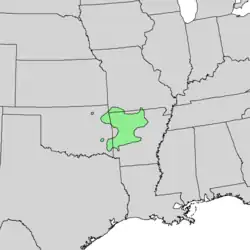 It grows in the Ozark Mountains and Ouachita Mountains of Missouri, Arkansas, Texas, Louisiana and Oklahoma.[3] It is possibly extirpated from Alabama.