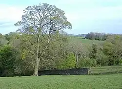 After crossing the Rhondda, the road rises out of the valley in a southerly direction nearly due south to Castellau. Castellau is located less than a mile north-west of Beddau.[4] A forge was situated in a small valley, Darren Ddeusant,[5] extending upwards by the mansion, Castellau House, into the hills to the north of Llantrisant.[6] This hamlet contains some coal works, part of the produce of which is shipped for Ireland.[2]