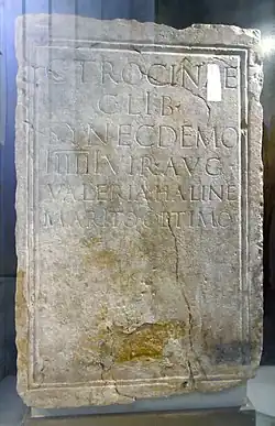 This was interpreted as "To Caius Trocina Synecdemus, freedman of Caius, sevir augustalis, (dedicated by his wife) Valeria Haline for having been an excellent husband".[18] The monument has been dated to the 2nd century AD.[19] The inscription identified the block as one that had been examined and recorded in the same rectory by an 18th-century antiquarian.[17] The excavator believes that the memorial stone was found very close to its original location, and that the Roman villa belonged to Trocina Synecdemus.[4]