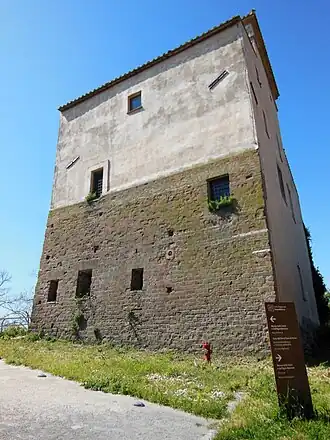 The construction of the tower dates back to the 11th century, but its existence is attested only from the beginning of the 16th century,[4] when the documents mention it as a "castle". The transformation in its present form dates back to this period, when the original height was probably reduced and buttresses were added. The first floor of the interior is supported by cross vaults. Near the former entrance door, which opened on the first floor, fragments of medieval decoration are walled up.