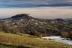 Castelnovo is best known for the Pietra di Bismantova spur. The pietra (literally "Rock of Bismantova") can be spotted from a distance of 30 kilometres (19 mi) as it stands at around 1,047 metres (3,435 ft) above sea level. The rock is a favourite climbing and abseiling destination throughout Italy and is considered a particularly difficult climb due to its outward-curving wall. The rock was mentioned by the Italian poet Dante Alighieri in the Divine Comedy.