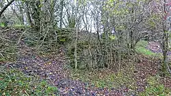 At least two coal pits are recorded,[27] one lying above Gadgirth Mains with some ruins remaining and the other with an engine house in the Byre Burn Glen.[22] In 1875 one miner was killed and a second mortally injured. William Kerr, aged around 50, was working in the No. 1 Gadgirth Pit, Annbank Colliery and had been excavating a wedge-hole when a one ton block of coal fell on him. Taken out of the adit and carried home he died shortly afterwards, leaving a widow and ten offspring. Only two hours later a similar accident happened to a David M'Crorie, a younger man. His left arm was amputated, but his other injuries were so serious that he is not thought to have pulled through.[28]