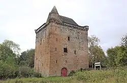 Gallow Law Cairn lies above the castle's location and it is said to have been the site of a barony court hangings in feudal times.[9] A Gallow Hill Cairn in 1926 was built by local miners to the memory of the Covenanter James Smith of Threepwood, who died for civil and religious liberty in 1684.[9]