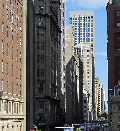 - Downing Centre – 302 Castlereagh Street, located with an entire city block bounded by Castlereagh, Liverpool, Elizabeth and Goulburn Streets, and constructed from 1908. Designed by Arthur Anderson, the building is an example of the Interwar Stripped Classical architectural style and was the site of the former Mark Foy's emporium. The building is listed on the NSW State Heritage Register.[18]