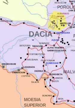 The castra of Desa was a fort in the Roman province of Dacia[1] on the north bank of the Danube opposite Ratiaria. Erected by the Romans in the 3rd century AD, its remains are located in Desa (Romania).[2] The fort remained in use until at least 305 AD,[3] when it was garrisoned by a vexillation of Legio XIII Gemina.