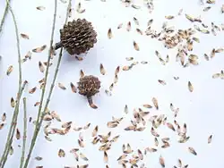 Glossy black cockatoos break the cones to eat the seeds, which mature in winter.[18] The seed is eaten by the red-browed finch,[19] and peaceful dove (Geopelia placida).[20]