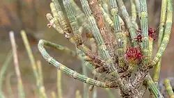 Casuarina pauper produces abundant viable seed, with regeneration success likely to be inhibited during periods of insufficient soil moisture. When present at low densities, plants tends to reproduce sexually, while established groves extend mostly from the fringes through root suckers, increasing the local area occupied by individual plants.[13][14]
