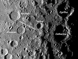 Catena Abulfeda is a chain of craters on the Moon that runs between the southern rim of the crater Abulfeda and the north rim of Almanon, then continues for a length of 210 kilometers across the Rupes Altai. It is located at 16°54′S 17°12′E / 16.9°S 17.2°E. This crater chain is the best known feature of its type on the Moon. It consists of a linear string of 20 impact craters ranging in size from 1 to 3 km in diameter. The largest, Almanon C, is positioned near the middle of the chain.[1]