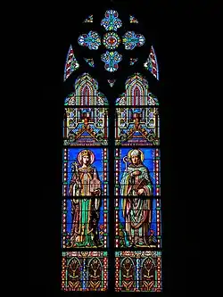 • St. Gwenaël's Chapel, south entrance (pos. 5): Saint Gwenaël[2] took part in the evangelization of the West Diocese in the 6th century. In the stained glass window he is represented in the company of Blessed Françoise d'Amboise, duchess of Brittany and the founder of the first convent of the Carmelites in Vannes.