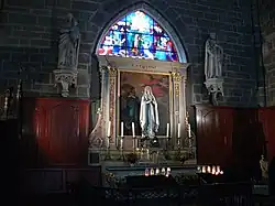 • Our Lady of Lourdes' Chapel, south transept (pos. 6): this is the place of the old door of the Dukes of Brittany. The stained glass window shows the First Communion of Françoise d'Amboise. Above the window is Saint Peter, to the left a painting of the ascent of Saint Petronilla [3] [4] to Heaven. Before the French Revolution, this was the site of the tomb of St. Gwenaël. To the right of the altar Mme. Francheville is buried, a local mystic.