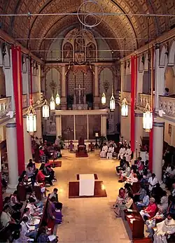 Meanwhile, Ferrario was also responsible for sending the thirty-six statuettes of saints back to France to be professionally preserved. When the statues returned, they were placed in a new, more logical order of placement in accordance with the Litany of the Saints. In one of the most drastic changes yet, pews were re-arranged to face each other while the altar and ambo were positioned in the center aisle in 1993. A eucharistic devotional area was created in front of the tabernacle and a semitransparent screen was raised to separate it from the rest of the church. The cathedra of the bishop was placed in front of this screen and the sedia, or the chair of the priest-celebrant, was positioned among the pews.[1]