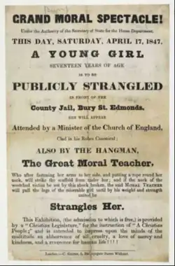 The execution was highly publicised in advance and was described as a "public strangulation". She was hanged in front of a crowd of 10,000 persons at Market Hill in a meadow on the west side of the Prison at Bury St Edmunds at 9am on Saturday 17 April 1847. The drop did not kill her and she "danced" for several minutes before dying. The crowd shouted "shame" and "murder".[16] She was the last woman to be hanged in Suffolk.[17]