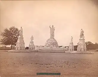Kirn exhibited a 12-foot diameter plaster of Paris model of the Catholic fountain as early as February 1874 at the city's Academy of Music.[10] Fundraising for the project was slow, and it was the following autumn that Kirn formally received the commission.[11] Tyrolean marble was chosen for the statues, and Kirn moved to southern Austria to carve them at a quarry in Laas.[12]